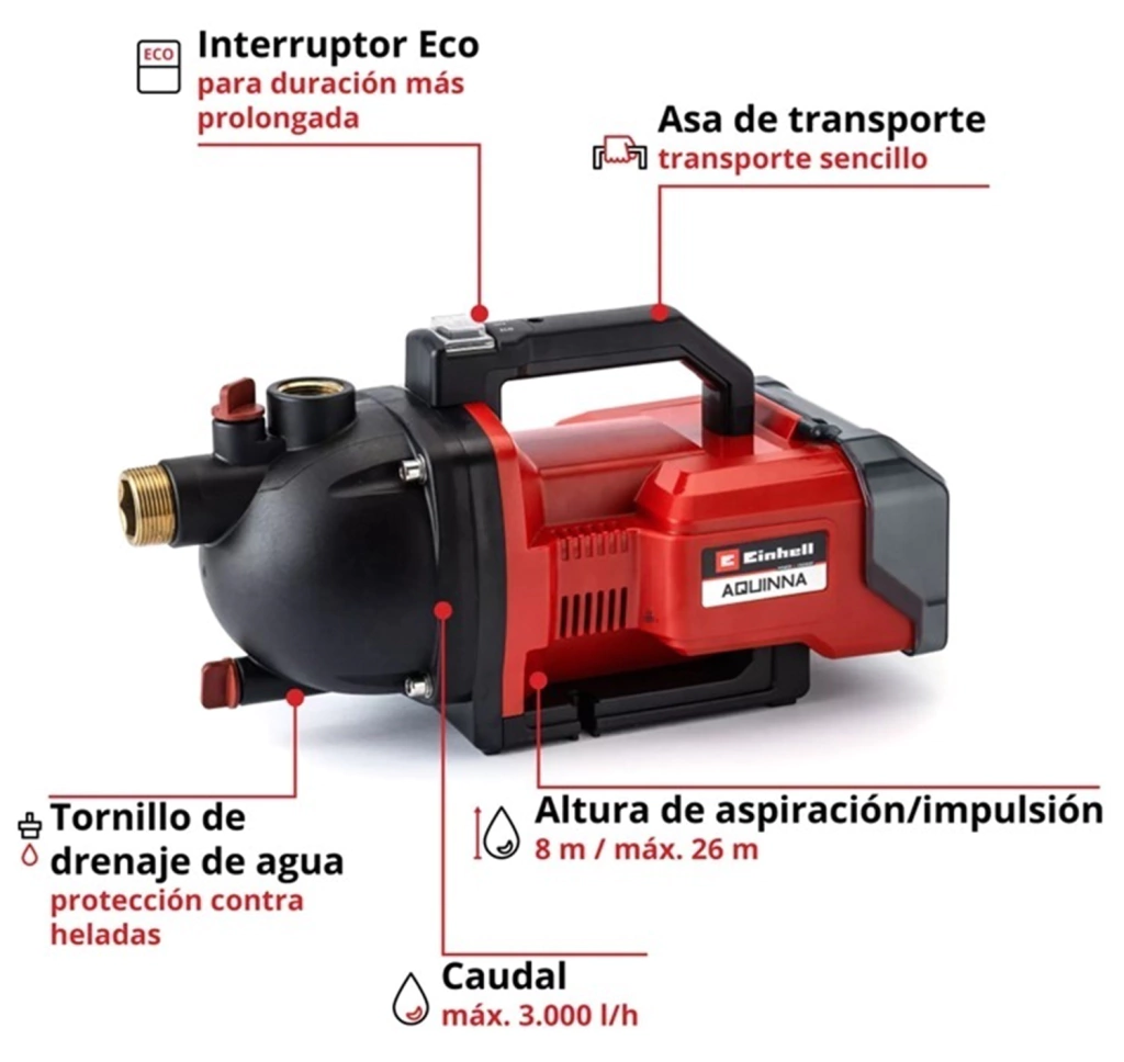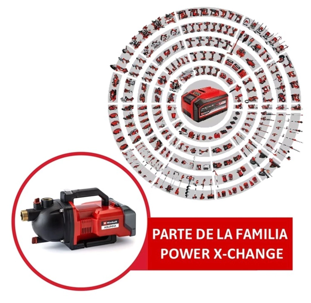Con la bomba de jardín inalámbrica Einhell AQUINNA 36/30 podrá utilizar en cualquier momento agua de lluvia, de pozo o de cisterna en su jardín y espacios verdes, ahorrando dinero y protegiendo el medio ambiente. La bomba de jardín AQUINNA obtiene su energía de 2 baterías Power X-Change de 18 V. Diseñadas como miembro de la potente familia Power X-Change, todas las baterías de la serie System se pueden utilizar con una flexibilidad ilimitada en las herramientas de taller y jardín de la serie System. El interruptor ECO de dos etapas garantiza el ajuste correcto: ya sea en modo de ahorro de energía con menor presión de suministro o con máxima potencia. Con una altura de impulsión de hasta 26 metros, una altura de aspiración de hasta 8 metros y un caudal máximo de 3.000 litros por hora, la bomba de jardín a batería AQUINNA también destaca en términos de rendimiento. La conexión en el lado de succión es de 42 mm (rosca macho de 1 1/4") y en el lado de presión, de 33,3 mm (rosca hembra R1). Se incluyen un tornillo de llenado y un tornillo de vaciado de agua para protegerla contra las heladas. Esto permite guardar la bomba de jardín de forma segura durante la temporada de frío. La protección contra sobrecargas protege el motor contra daños por sobrecalentamiento. Gracias a su práctica asa de transporte, la bomba de jardín inalámbrica se puede transportar rápidamente a cualquier lugar. La batería y el cargador no están incluidos. Estos se venden por separado, por ejemplo, como un práctico kit de inicio de Einhell.