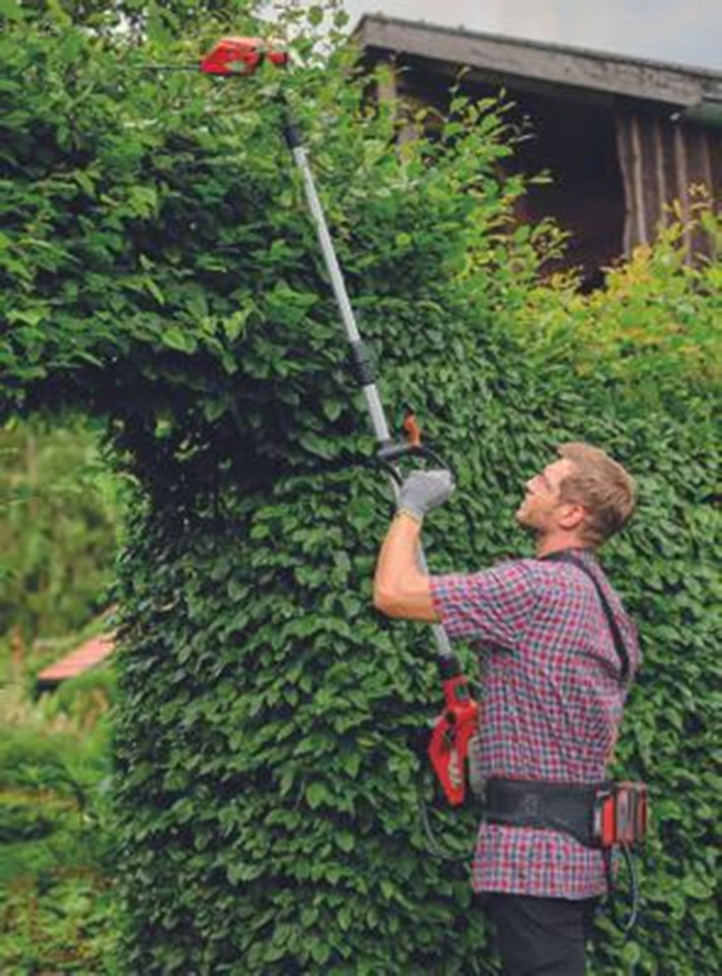 El cinturón de batería es el accesorio perfecto para trabajar en altura, por ejemplo con una podadora de pértiga, de forma ahorradora y equilibrada. El dispositivo se puede sujetar mejor y guiar con mayor precisión sin el peso adicional de las baterías.