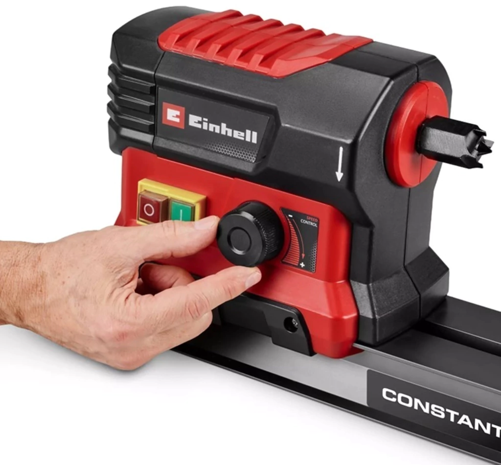 El Einhell torno TC-WW 600 CE Vario es una máquina potente y fiable para trabajos de torneado precisos. Con su motor de 600 W y la electrónica constante integrada, la máquina de torneado ofrece de forma fiable alta potencia fiable, incluso bajo carga. Por lo tanto, es adecuado para el procesamiento de diversos tipos de madera, desde madera blanda hasta madera dura. A través de la regulación de velocidad electrónica, la velocidad de giro se puede ajustar de forma continua entre 800 y 3.000 revoluciones por minuto y adaptarse al paso de trabajo respectivo. El posicionador con punta de punzón, al igual que el soporte de la pieza de trabajo, se puede ajustar de forma flexible en el carril guía de aluminio y se puede fijar fácilmente mediante una palanca de sujeción rápida. De este modo, se pueden sujetar y mecanizar piezas de hasta 60 cm con un diámetro máx. de hasta 25 cm. El soporte de pieza de trabajo tiene una longitud de 22 cm y se puede adaptar en función de la herramienta de torneado utilizada y la tarea. En lugar de la punta del punzón, también se puede montar el disco frontal suministrado (Ø 80 mm) para tornear, por ejemplo, platos, bandejas o vasos. Mediante orificios en el carril guía y el material de montaje suministrado, la máquina de torneado también se puede fijar de forma fija, por ejemplo, en el banco de trabajo.